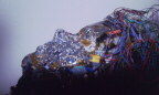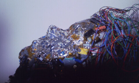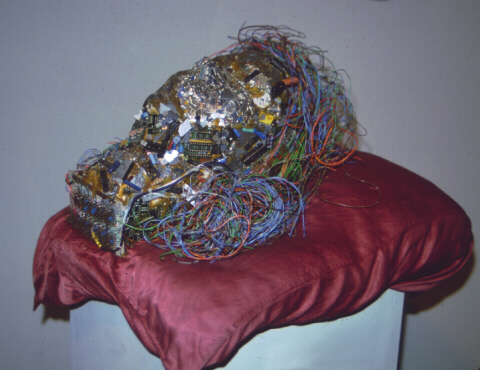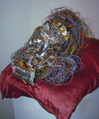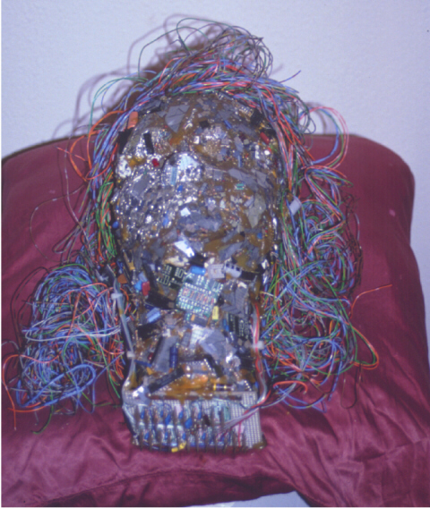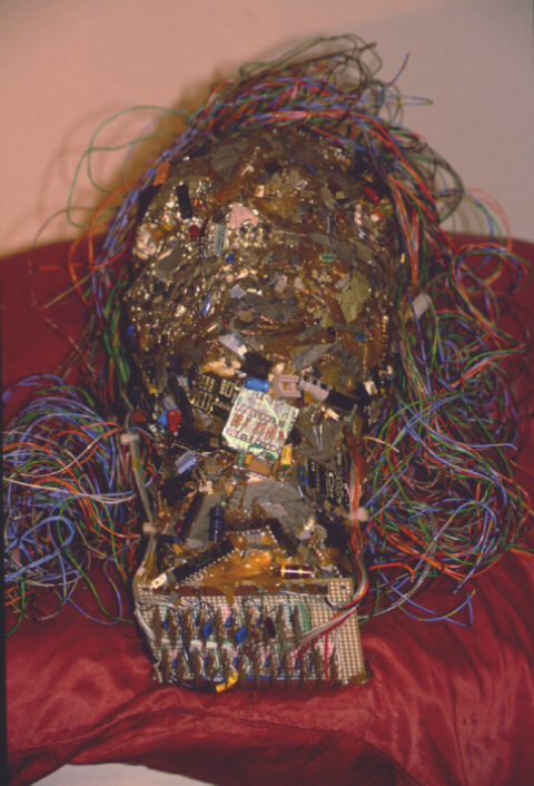 "Shattered Dreams" is actually a portrait of my eldest son, Mark. I made this piece after he joined the Air Force. (I was more than a little upset.) The piece is made with broken and shattered computer parts including shattered silicon wafers. The hair is telephone wire and the bottom of the neck is a "wish board" that was non functional, all rest on a Satin Pillow.