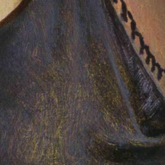 I decided to show you the most obvious use of the above mentioned method. This young lady wore a blouse which was made in two layers of fabric: solid yellow and sheer black. I painted the lower yellow layer first. When that was dry, I painted the shear black layer, and while still wet, I scratched back to reveal the yellow and shape the folds (hog bristle brushes scratch nicely). When the black layer dried, I applied a scumble of a blue-white tint to represent the lit side of the folds in the shear black fabric. This method is used all over this painting, as well as many others, but because the colors in most passages are often similar, I doubt you would see the distinct layers in a computer image. However, check this detail from the Child's Portrait, and see if you can identify the separate gauzy layers from bottom to top in the rendering of skin.