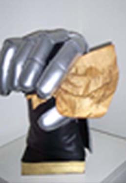 The armoured fist crushing the Bill of Rights represents the political and religious Right trying to impose their ideas and beliefs on the American people by revising our laws and our educational system, a system that allows us to think and believe differently. This sculpture is a protest against their invasion into the way our country is governed.