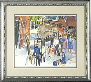 This charming piece brings back memories of a special happy time. The scene plays at the Central Park Zoo, where elephants are served treats by visitors on a wonderful summer day. A rather large lady in a blue dress smiles with glee, and a mother tends her child's shoe as balloons float in the crowded backdrop. The mix of events and characters make for a very real and magical moment that is full of cheer and quite unforgettable. As with all of his works this piece was completed on location.