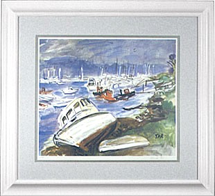 This marine piece features a vessel swept ashore under a stormy sky with an intense harbor back-drop. Inspired by a setting at Long Island's Huntington Harbor, this dramatic scene is a favorite as it reflects the drama of the moment in unique painterly fashion. As with all of his works this piece was completed on location.