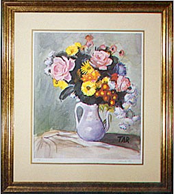 This elegant piece features large pink roses, daisies and mixed mums in an Italian teapot, with pale green pastel background and cream colored cloth base. A majestic floral combination with contemporary colors, this work shows Tar's ability to mix new and old styles. The viewer is moved with a sense of class and beauty. Framed, this work is truly spactacular and something to see ...and feel!