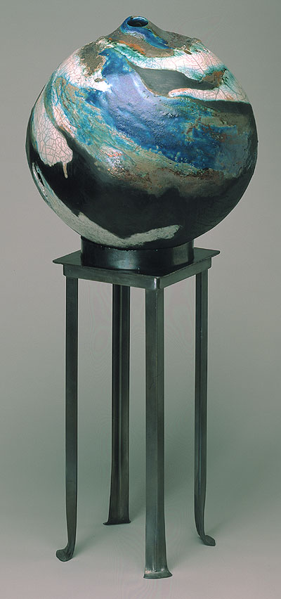 The most careful calibration of heat and time and reduction of oxygen causes dark and delicate weblike cracking, like rivers crossing through now emergent continents of colored mass. In this way simple clay is transformed, and something new is called to stand out into existence like a planet newly born.