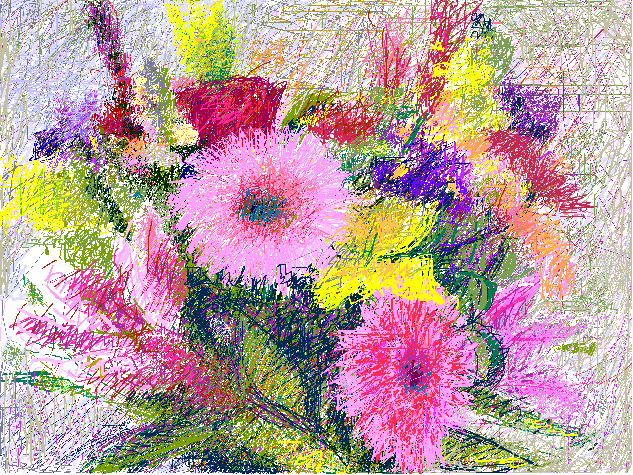 This painting is titles "Flowers from MaryAnn". MaryAnn is deeply interested in art on the Web. We exchange ideas. It is fun. One day she sent me these flowers. They were so beautiful. Both they and my memory of them faded; but there remains this drawing and a certain essence in my heart.