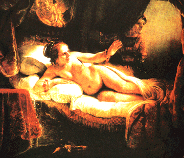 One Saturday afternoon in the summer of 1985, this beautiful work by Rembrandt was viciously attacked by a madman. The perpetrator lunged at the painting with a knife, slashing the lower belly and pouring a liter of sulfuric acid on the canvas forming a bubbling mass that tricked to the floor. His identity has never been disclosed. The damage was terrifying. So much of the painting was destroyed that it took years to even decide how to go about salvaging what was left. Finally it has been reintroduced. But what you see in Danae today is not the original Rembrandt but rather the spirit of Rembrandt. This is the original painting photographed before the attack.
