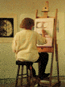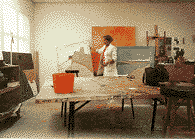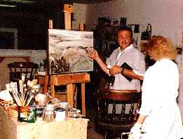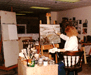 Here I am at work in the studio. The location is a very large floor in a commercial shopping complex on the Plaza in Santa Fe. Other artists shared the space from time to time and master classes were held here led by famous artists, Helen Frankenthaler, Richard Diebenkorn, Nathan Oliviera, Nancy Graves and many others. The atmosphere was one of total silence and deep concentration. Making art is serious business we thought. We took ourselves and our art very seriously.