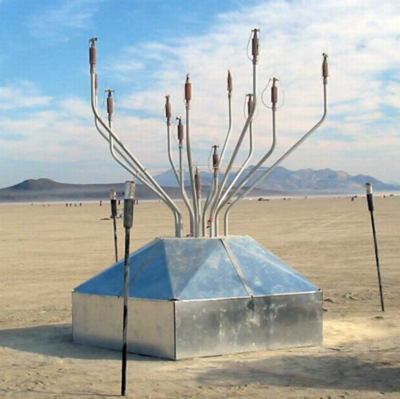 Voice of Fire is a sound sculpture with 13 flames that act as speakers. As people speak into the microphone, their voice comes out on the thirteen flames at different delays. As they are speaking, their voice is recorded, and when no one is speaking, the system plays back random bits of people speaking, different soundbites on different flames, gradually fading away to silence. |
